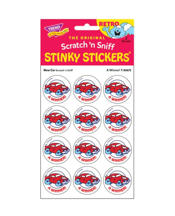 Get a whiff of this A Winner!, New Car-scented sticker! TREND Scratch 'n Sniff Stinky Stickers® from the '80s are BACK! And they're SCENT-sational! Fun to collect, trade, and celebrate accomplishments and special occasions. Collectors will be happy to spot the ★ to distinguish TREND Retro Stinky Stickers® from those printed in the 1980s. Nose-talgia note: The very first stickers with this design were released with a "Gasoline" scent. We switched to "New Car" around Fall 1983. Each package comes with 2 sheets of 12 identical stickers.