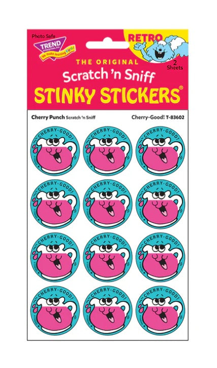 Get a whiff of this Cherry-Good!, cherry punch-scented sticker! Break out your sticker books! These are the TREND brand Retro Scratch 'n Sniff Stinky Stickers® and they are SCENT-sational! Fun to collect, trade, and celebrate accomplishments and special occasions. Collectors will be happy to spot the ★ to distinguish TREND Retro Stinky Stickers® from those printed in the 1980s. Each pack contains 2 sheets of 12 identical stickers, perfect for sharing or trading.