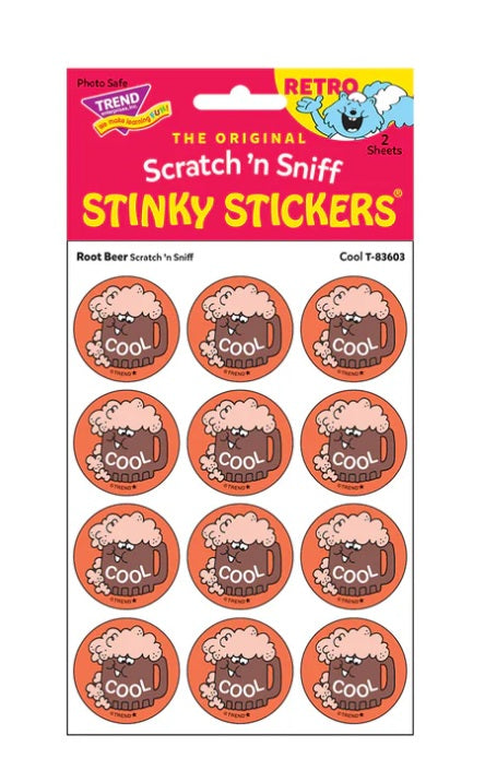 Get a whiff of this Cool, root beer-scented sticker! Break out your sticker books! These are the TREND brand Retro Scratch 'n Sniff Stinky Stickers® and they are SCENT-sational! Fun to collect, trade, and celebrate accomplishments and special occasions. Collectors will be happy to spot the ★ to distinguish TREND Retro Stinky Stickers® from those printed in the 1980s. Each pack contains 2 sheets of 12 identical stickers, perfect for sharing or trading.