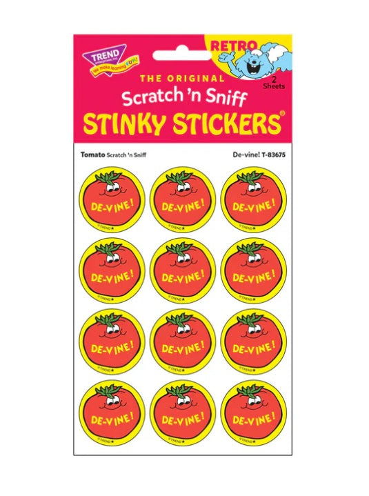 Get a whiff of this De-vine!, fresh-off-the-vine tomato-scented sticker! Break out your sticker books! These are the TREND brand Retro Scratch 'n Sniff Stinky Stickers® and they are SCENT-sational! Fun to collect, trade, and celebrate accomplishments and special occasions. Collectors will be happy to spot the ★ to distinguish TREND Retro Stinky Stickers® from those printed in the 1980s. Each pack contains 2 sheets of 12 identical stickers, perfect for sharing or trading.