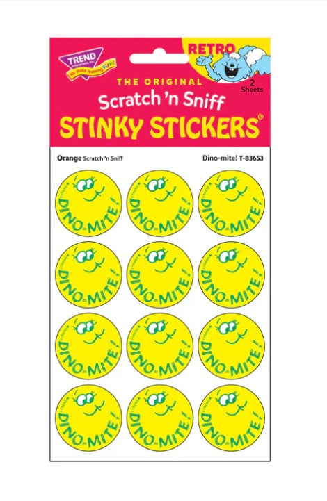 Get a whiff of this Dino-mite!, orange-scented smiley sticker! Break out your sticker books! These are the TREND brand Retro Scratch 'n Sniff Stinky Stickers® and they are SCENT-sational! Fun to collect, trade, and celebrate accomplishments and special occasions. Collectors will be happy to spot the ★ to distinguish TREND Retro Stinky Stickers® from those printed in the 1980s. Each pack contains 2 sheets of 12 identical stickers, perfect for sharing or trading.