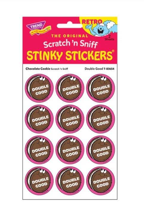 Get a whiff of this Double Good, chocolate cookie-scented sticker! Break out your sticker books! These are the TREND brand Retro Scratch 'n Sniff Stinky Stickers® and they are SCENT-sational! Fun to collect, trade, and celebrate accomplishments and special occasions. Collectors will be happy to spot the ★ to distinguish TREND Retro Stinky Stickers® from those printed in the 1980s. Each pack contains 2 sheets of 12 identical stickers, perfect for sharing or trading.