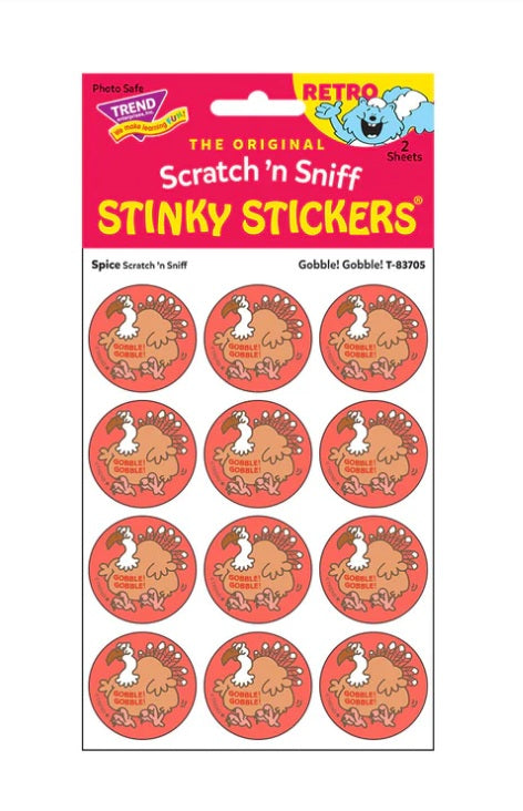 Get a whiff of this Gooble! Gooble!, spice-scented turkey sticker! Break out your sticker books! These are the TREND brand Retro Scratch 'n Sniff Stinky Stickers® and they are SCENT-sational! Fun to collect, trade, and celebrate accomplishments and special occasions. Collectors will be happy to spot the ★ to distinguish TREND Retro Stinky Stickers® from those printed in the 1980s. Each pack contains 2 sheets of 12 identical stickers, perfect for sharing or trading.