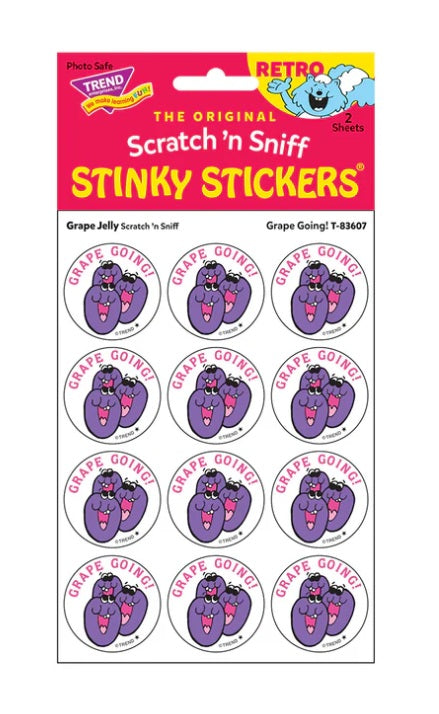 Get a whiff of this Grape Going!, grape jelly-scented sticker! Break out your sticker books! These are the TREND brand Retro Scratch 'n Sniff Stinky Stickers® and they are SCENT-sational! Fun to collect, trade, and celebrate accomplishments and special occasions. Collectors will be happy to spot the ★ to distinguish TREND Retro Stinky Stickers® from those printed in the 1980s. Each pack contains 2 sheets of 12 identical stickers, perfect for sharing or trading.