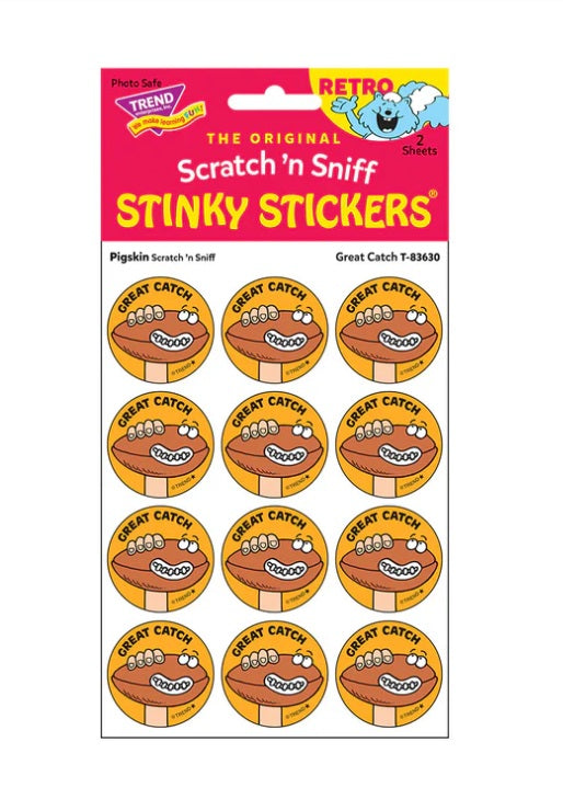 Get a whiff of this Great Catch, pigskin-scented football sticker! Break out your sticker books! These are the TREND brand Retro Scratch 'n Sniff Stinky Stickers® and they are SCENT-sational! Fun to collect, trade, and celebrate accomplishments and special occasions. Collectors will be happy to spot the ★ to distinguish TREND Retro Stinky Stickers® from those printed in the 1980s. Each pack contains 2 sheets of 12 identical stickers, perfect for sharing or trading.