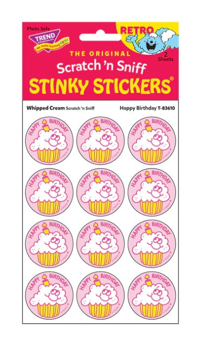 Get a whiff of this Happy Birthday, whipped cream-scented cupcake sticker! Break out your sticker books! These are the TREND brand Retro Scratch 'n Sniff Stinky Stickers® and they are SCENT-sational! Fun to collect, trade, and celebrate accomplishments and special occasions. Collectors will be happy to spot the ★ to distinguish TREND Retro Stinky Stickers® from those printed in the 1980s. Each pack contains 2 sheets of 12 identical stickers, perfect for sharing or trading.
