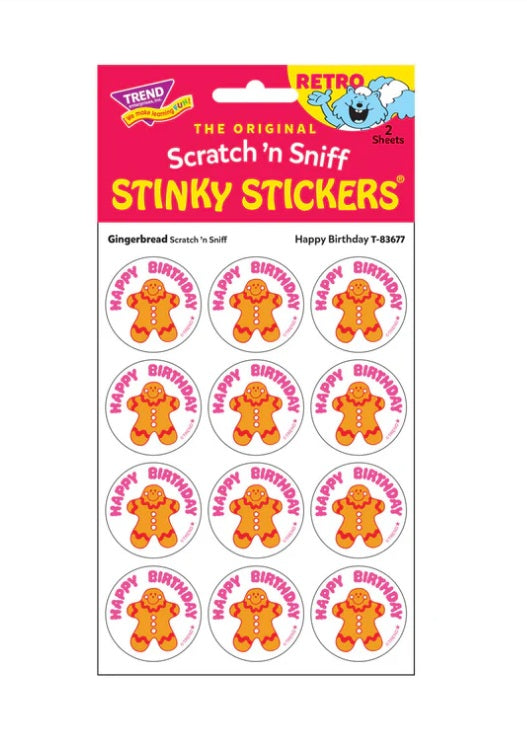 Get a whiff of this Happy Birthday, gingerbread-scented cookie sticker! Break out your sticker books! These are the TREND brand Retro Scratch 'n Sniff Stinky Stickers® and they are SCENT-sational! Fun to collect, trade, and celebrate accomplishments and special occasions. Collectors will be happy to spot the ★ to distinguish TREND Retro Stinky Stickers® from those printed in the 1980s. Each pack contains 2 sheets of 12 identical stickers, perfect for sharing or trading.