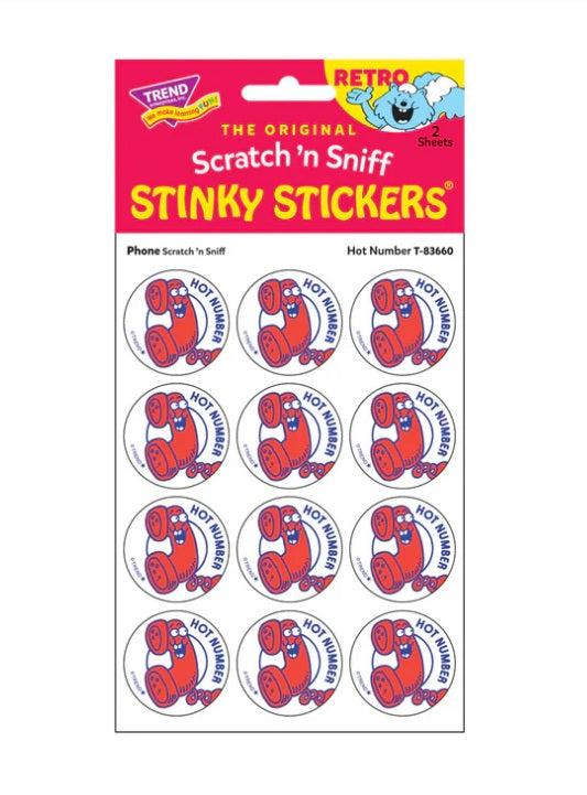 Get a whiff of this Hot Number, cinnamon-candy phone-scented sticker! Break out your sticker books! These are the TREND brand Retro Scratch 'n Sniff Stinky Stickers® and they are SCENT-sational! Fun to collect, trade, and celebrate accomplishments and special occasions. Collectors will be happy to spot the ★ to distinguish TREND Retro Stinky Stickers® from those printed in the 1980s. Each pack contains 2 sheets of 12 identical stickers, perfect for sharing or trading.