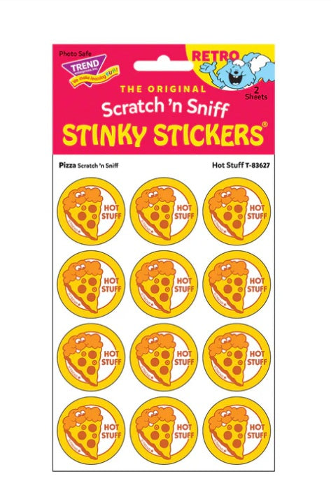 Get a whiff of this Hot Stuff, pizza-scented sticker! Break out your sticker books! These are the TREND brand Retro Scratch 'n Sniff Stinky Stickers® and they are SCENT-sational! Fun to collect, trade, and celebrate accomplishments and special occasions. Collectors will be happy to spot the ★ to distinguish TREND Retro Stinky Stickers® from those printed in the 1980s. Each pack contains 2 sheets of 12 identical stickers, perfect for sharing or trading.