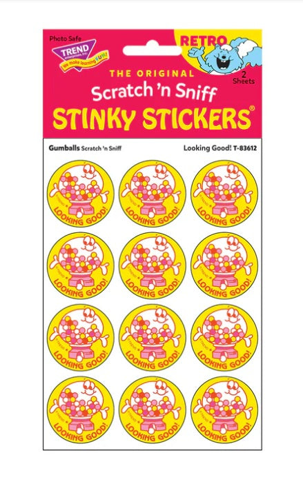Get a whiff of this Looking Good!, gumballs-scented sticker! Break out your sticker books! These are the TREND brand Retro Scratch 'n Sniff Stinky Stickers® and they are SCENT-sational! Fun to collect, trade, and celebrate accomplishments and special occasions. Collectors will be happy to spot the ★ to distinguish TREND Retro Stinky Stickers® from those printed in the 1980s. Each pack contains 2 sheets of 12 identical stickers, perfect for sharing or trading.