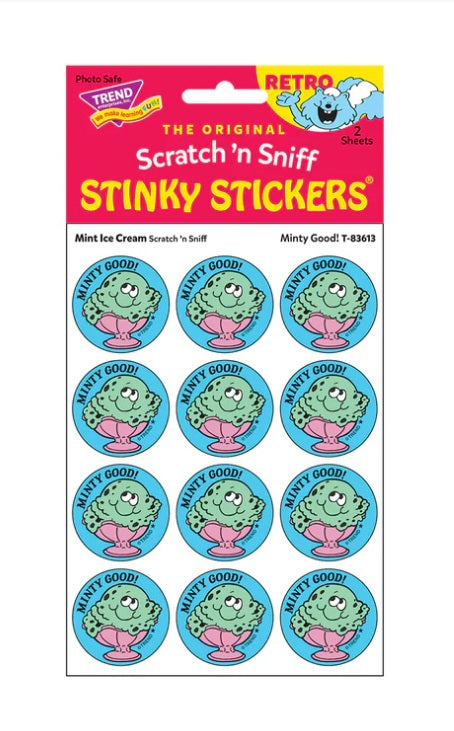 Get a whiff of this Minty Good!, mint ice cream-scented sticker! Break out your sticker books! These are the TREND brand Retro Scratch 'n Sniff Stinky Stickers® and they are SCENT-sational! Fun to collect, trade, and celebrate accomplishments and special occasions. Collectors will be happy to spot the ★ to distinguish TREND Retro Stinky Stickers® from those printed in the 1980s. Each pack contains 2 sheets of 12 identical stickers, perfect for sharing or trading.