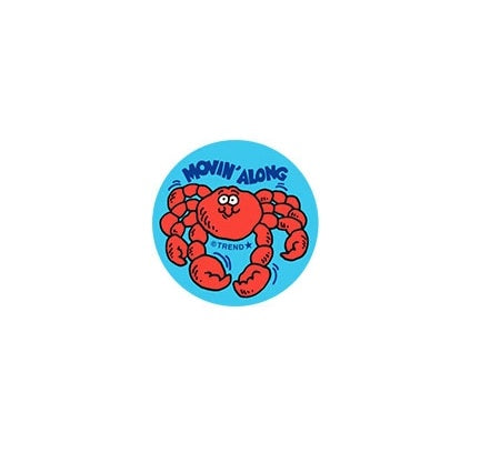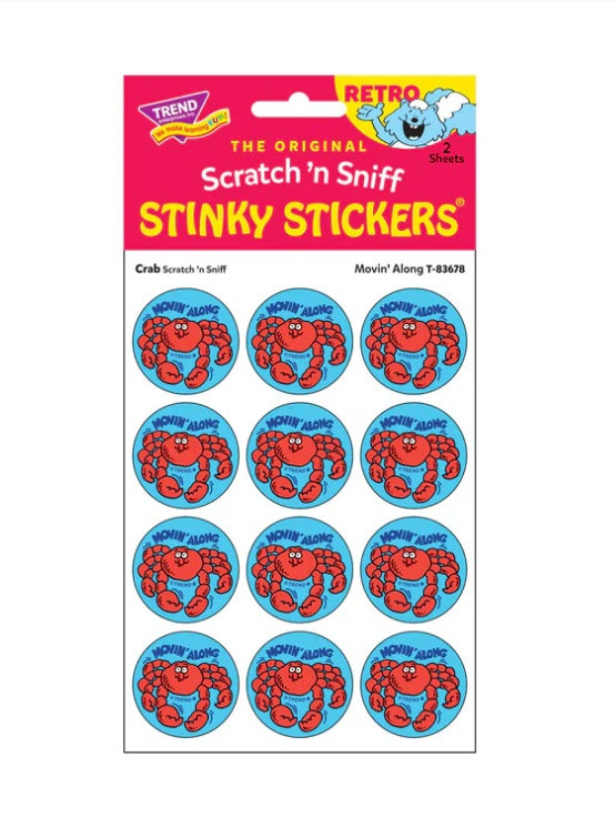 Get a whiff of this Movin' Along, crab-scented sticker! It may get you thinking of dipping into melted garlic butter. Break out your sticker books! These are the TREND brand Retro Scratch 'n Sniff Stinky Stickers® and they are SCENT-sational! Fun to collect, trade, and celebrate accomplishments and special occasions. Collectors will be happy to spot the ★ to distinguish TREND Retro Stinky Stickers® from those printed in the 1980s. Each pack contains 2 sheets of 12 identical stickers, perfect for sharing or trading.
