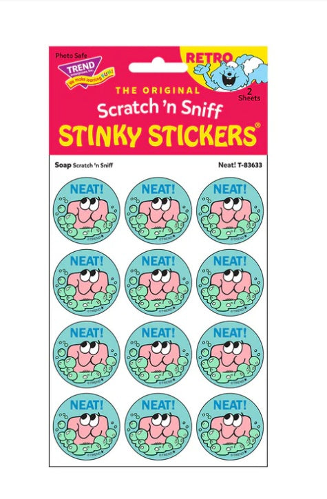 Get a whiff of this Neat!, soap-scented sticker! Break out your sticker books! These are the TREND brand Retro Scratch 'n Sniff Stinky Stickers® and they are SCENT-sational! Fun to collect, trade, and celebrate accomplishments and special occasions. Collectors will be happy to spot the ★ to distinguish TREND Retro Stinky Stickers® from those printed in the 1980s. Each pack contains 2 sheets of 12 identical stickers, perfect for sharing or trading.