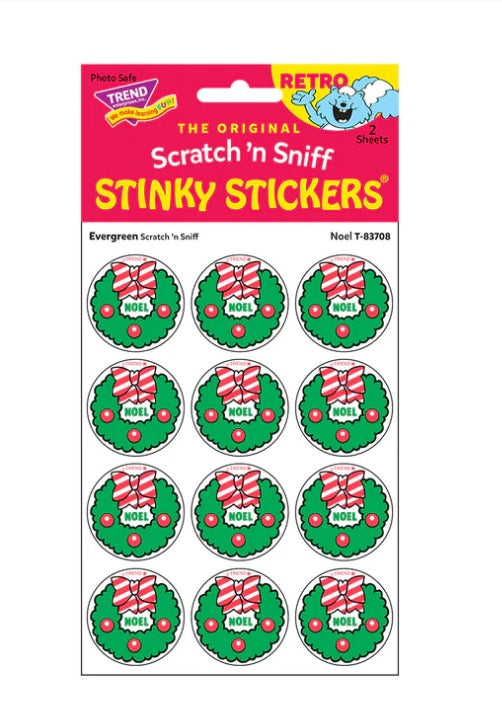 Get a whiff of this Noel, evergreen-scented wreath sticker! Break out your sticker books! These are the TREND brand Retro Scratch 'n Sniff Stinky Stickers® and they are SCENT-sational! Fun to collect, trade, and celebrate accomplishments and special occasions. Collectors will be happy to spot the ★ to distinguish TREND Retro Stinky Stickers® from those printed in the 1980s. Each pack contains 2 sheets of 12 identical stickers, perfect for sharing or trading.