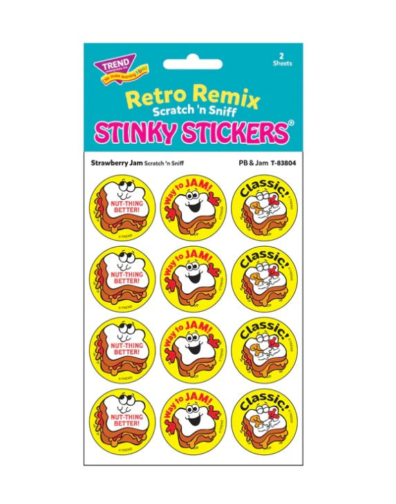 Get a whiff of this remix PB & Jam, Strawberry Jam-scented sandwich sticker! First there was RETRO, now there's RETRO Remix! Trend Enterprises took their iconic Scratch 'n Sniff Stinky Stickers® designs from the '80s and added a twist: multiple designs, additional messages, and sometimes a new scent. They're SCENT-sational! Fun to collect, trade, and celebrate accomplishments and special occasions. 3 different designs of the same scent, 24 stickers in total per pack.