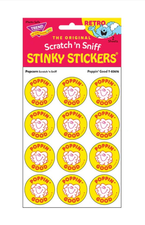 Get a whiff of this Poppin' Good, popcorn-scented sticker! Break out your sticker books! These are the TREND brand Retro Scratch 'n Sniff Stinky Stickers® and they are SCENT-sational! Fun to collect, trade, and celebrate accomplishments and special occasions. Collectors will be happy to spot the ★ to distinguish TREND Retro Stinky Stickers® from those printed in the 1980s. Each pack contains 2 sheets of 12 identical stickers, perfect for sharing or trading.