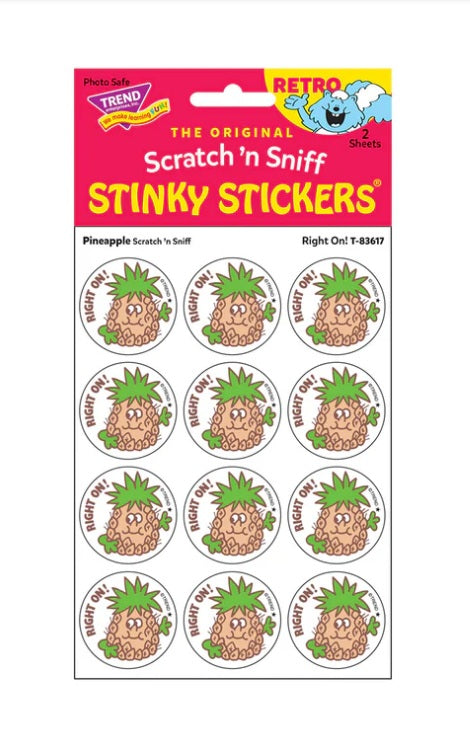 Get a whiff of this Right On!, pineapple-scented sticker! Break out your sticker books! These are the TREND brand Retro Scratch 'n Sniff Stinky Stickers® and they are SCENT-sational! Fun to collect, trade, and celebrate accomplishments and special occasions. Collectors will be happy to spot the ★ to distinguish TREND Retro Stinky Stickers® from those printed in the 1980s. Each pack contains 2 sheets of 12 identical stickers, perfect for sharing or trading.