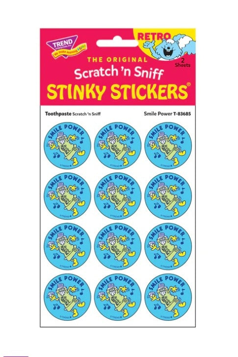 Get a whiff of this Smile Power, toothpaste-scented sticker! Break out your sticker books! These are the TREND brand Retro Scratch 'n Sniff Stinky Stickers® and they are SCENT-sational! Fun to collect, trade, and celebrate accomplishments and special occasions. Collectors will be happy to spot the ★ to distinguish TREND Retro Stinky Stickers® from those printed in the 1980s. Each pack contains 2 sheets of 12 identical stickers, perfect for sharing or trading.
