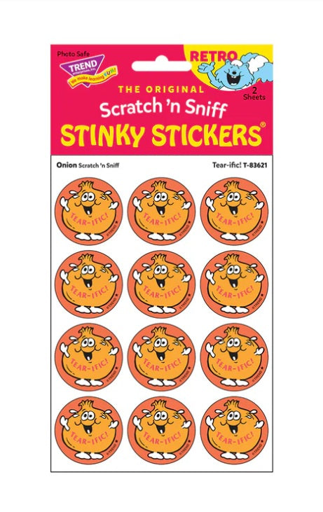 Get a whiff of this Tear-ific!, onion-scented sticker! Break out your sticker books! These are the TREND brand Retro Scratch 'n Sniff Stinky Stickers® and they are SCENT-sational! Fun to collect, trade, and celebrate accomplishments and special occasions. Collectors will be happy to spot the ★ to distinguish TREND Retro Stinky Stickers® from those printed in the 1980s. Each pack contains 2 sheets of 12 identical stickers, perfect for sharing or trading.
