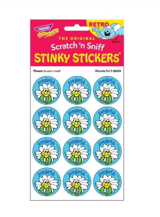 Get a whiff of this Wonderful, flower-scented sticker! Break out your sticker books! These are the TREND brand Retro Scratch 'n Sniff Stinky Stickers® and they are SCENT-sational! Fun to collect, trade, and celebrate accomplishments and special occasions. Collectors will be happy to spot the ★ to distinguish TREND Retro Stinky Stickers® from those printed in the 1980s. Each pack contains 2 sheets of 12 identical stickers, perfect for sharing or trading.