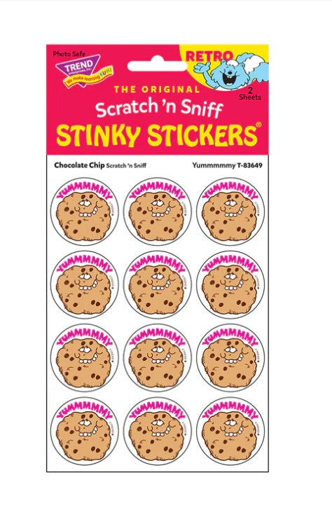 Get a whiff of this Yummmmmy, chocolate chip-scented cookie sticker! Break out your sticker books! These are the TREND brand Retro Scratch 'n Sniff Stinky Stickers® and they are SCENT-sational! Fun to collect, trade, and celebrate accomplishments and special occasions. Collectors will be happy to spot the ★ to distinguish TREND Retro Stinky Stickers® from those printed in the 1980s. Each pack contains 2 sheets of 12 identical stickers, perfect for sharing or trading.